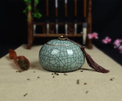 Longquan celadon & Geyao plum green & Diyao power blue & oblate tea caddy & sealing canister ; small size Geyao iron wire powder blue